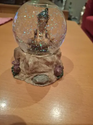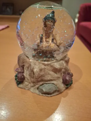 Adorna tu espacio con esta encantadora bola de cristal. Contiene una figura de duende sentada sobre una seta y la bola esta sobre una base rocosa, rodeada de purpurina que crea un efecto mágico. - Figura de duende detallada. - Base con diseño de roca y setas. - Interior con purpurina brillante. - 9 cm de alto, las base 7,5 cm Uso decorativo, como nuevo, bien cuidado. Se hacen packs y envios por wallapop o entrega en mano en Artés.