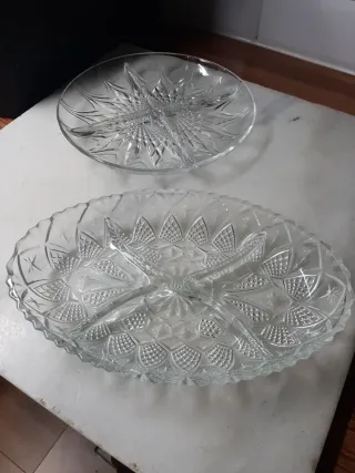 Set de dos bandejas de cristal para servir aperitivos o tapas. - Bandeja redonda con divisiones. - Bandeja ovalada con diseño labrado.