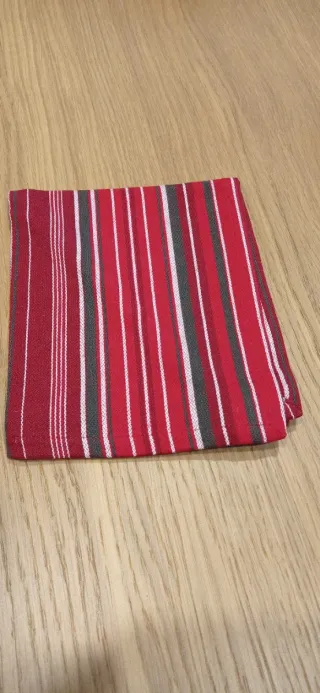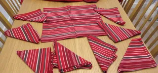 Conjunto de servilletas de algodón con un diseño inspirado en el estilo vasco. Presentan un patrón de rayas rojas, blancas y verdes. Posibilidad de mantel a juego. Confección modista. 7 servis 40x35cm 2 servis 35 x35cm - Tejido de algodón. Lavar por separado al principio. - Diseño a rayas.