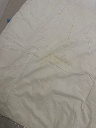 Edredón de poliéster blanco, ideal para camas de 90cm. Extra cálido - Medidas: 150x200cm. - Diseño acolchado. - Borde con detalle de rayas. Como se ve en las imágenes tiene machas de haber estado guardado