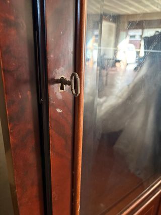 Elegante mueble vitrina con detalles dorados. - Estructura principal de madera. - Puerta con cristal. - Acabados en tonos marrones y dorados.