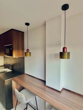 Conjunto de dos lámparas colgantes de diseño. Compré 4 pero sólo he usado 2. Las que vendo están en su caja totalmente nuevas. - Lámpara de vidrio verde - Casquillo decorativo metal granate. - Medidas según foto.