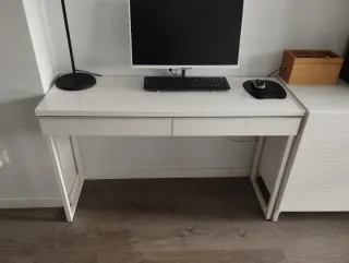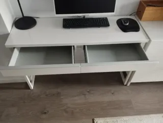 Escritorio moderno de Ikea, modelo Besta Burs. Su diseño minimalista se adapta a cualquier espacio. - Acabado blanco brillante. - Patas de metal. - Cajones integrados. Medidas 120x40x74 cm