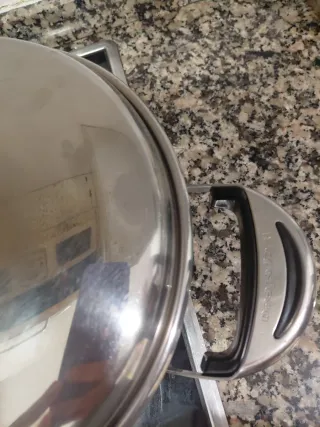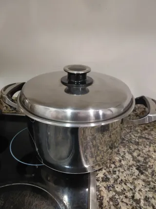 Olla de cocina de la marca Megafesson, con un diseño moderno y funcional. - Acabado exterior plateado brillante. - Asas de plástico negro para un agarre cómodo. - Tapa metálica con pomo negro.