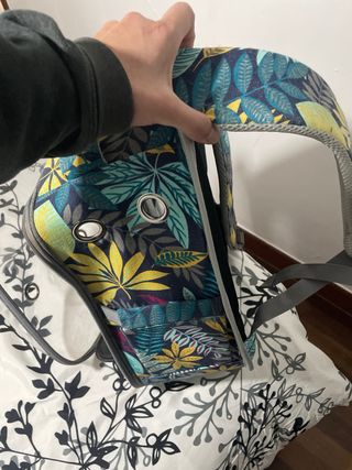 Mochila transportín con diseño de hojas tropicales y una burbuja transparente. - Cierre de cremallera. - Asa superior. - Ventilación lateral.