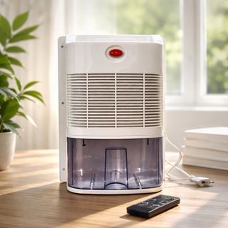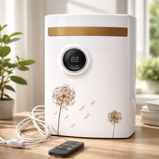 Deshumidificador blanco con un diseño moderno y elegante, adornado con un motivo de diente de león. Incluye un mando a distancia para un control cómodo. - Acabado en blanco y detalles dorados. - Pantalla digital integrada. - Mando a distancia incluido.