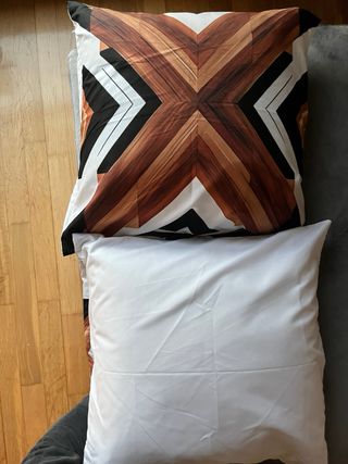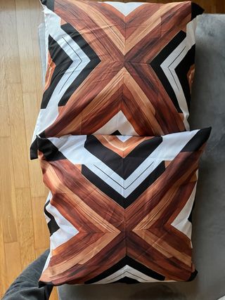 Cojín decorativo con un diseño geométrico que simula la veta de la madera. - Diseño moderno y llamativo. - Tacto agradable. Dos disponibles, se pueden ambos o solo 1