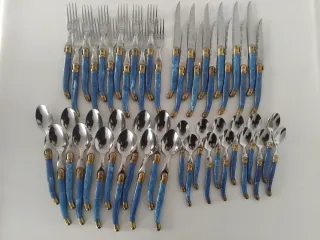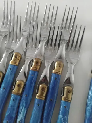 Conjunto de cubiertos Laguiole para doce personas. Acero inoxidable con los mangos de color azul con vetas blancas efecto mármol y las virolas de latón dorado. El set incluye 48 piezas: 12 cuchillos, 12 tenedores, 12 cucharas y 12 cucharillas de postre. Mangos curvos y mosca o abeja decorativa.