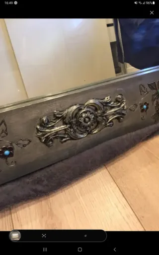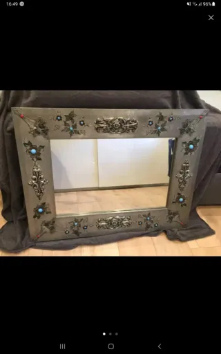 Elegante espejo con un marco detallado y adornos. - Marco con diseño floral y elementos ornamentales. - Acentos en color turquesa y rojo. - Acabado metálico plateado.