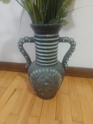Elegante jarrón de cerámica con un bonito diseño y un arreglo de flores artificiales. - Jarrón con acabado en gris y detalles en relieve. - Flores artificiales en tonos amarillos y ocres. - Asas decorativas a los lados del jarrón.