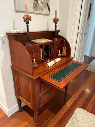 Mueble de madera maciza con diseño clásico y funcional. - Estantería con varios niveles de almacenamiento. - Incorpora un escritorio abatible con superficie forrada en piel verde. - Detalles ornamentales en la parte superior.