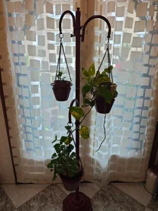 Estructura para exhibir tus plantas colgantes. Pregunta precio con tres plantas Escuchó ofertas - Fabricado en metal resistente. - Diseño de tres niveles para colgar macetas.
