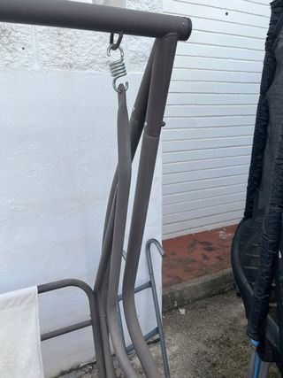 Balancín de jardín con estructura metálica y asiento de tela. - Toldo de tela beige cambiado hace un par de años. - Respaldo gastado pero en uso. - Asiento para cambiar. - Una pata oxidada (última foto), resto bien.