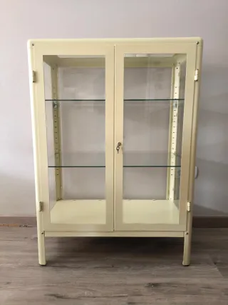 Vitrina de estilo vintage con estructura metálica y puertas de cristal. - Color beige. - Dos baldas de cristal interiores. - Cerradura con llave.