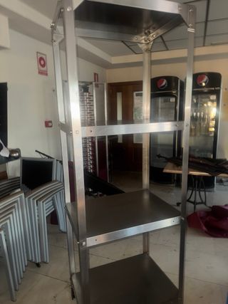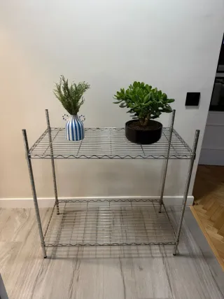 Estantería de metal con dos baldas, ideal para organizar tus objetos. - Diseño moderno y funcional. - Estructura resistente. Algunas zonas están oxidadas pero se podrían limar y pintar. Faltan algunas piezas que no afectan en su uso, se ha estado usando hasta ahora sin problema.