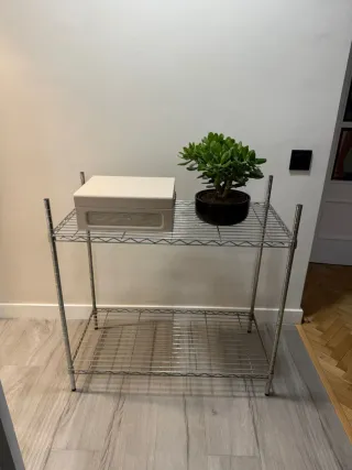 Estantería de acero inoxidable con dos niveles para organizar tus cosas. - Fabricada en metal resistente. - Diseño moderno y funcional.