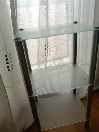 Estantería de acero inoxidable con baldas de cristal. 90cm de alto, 32cm de fondo y 42cm de ancho. Cristal de 50x30cm.