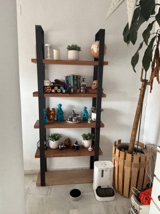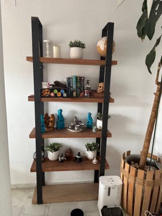 Estantería vertical estilo escalera en color negro/marrón oscuro, ideal para decoración, plantas, libros o pequeños objetos. Diseño estrecho que ocupa poco espacio (30cm de ancho) y se apoya en la pared. Estructura resistente con acabado efecto madera 4 baldas funcionales Estilo moderno y minimalista Fácil de colocar Tiene algunas marcas normales del uso (ver fotos), pero en general está en buen estado y sigue siendo estable y funcional.