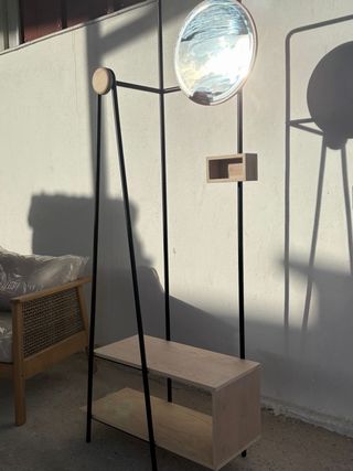 Mueble recibidor con un diseño moderno y funcional. Ideal para organizar tus objetos personales. - Estructura principal en metal negro. - Espejo redondo. - Dos baldas de madera. - Pequeña bandeja de madera. #recibidor #granada #nuevo #kavehome