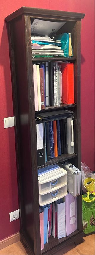 Estantería de madera maciza con un acabado en color marrón oscuro. Ideal para organizar libros y objetos. - Diseño alto y estrecho. - Múltiples baldas para almacenamiento. Posibilidad de comprar 1 o 2 unidades. Precio nueva 90€, se vende por 50.