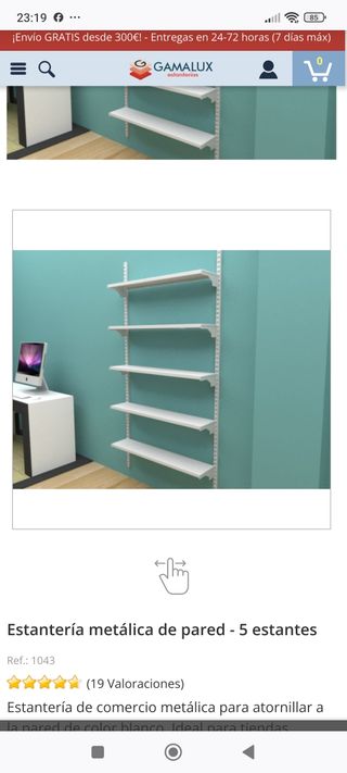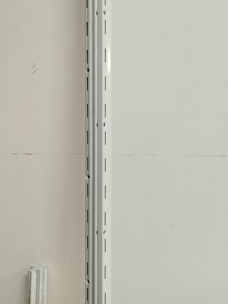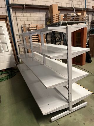 Varios productos de almacenaje: - Estanterías de pared (ancladas) metálicas de dos longitudes, graduables en altura: 72 escuadras de 30 cm 6 escuadras de 20cm. 10 rieles grandes 10 rieles pequeños - Posibilidad de incluir baldas de madera maciza.