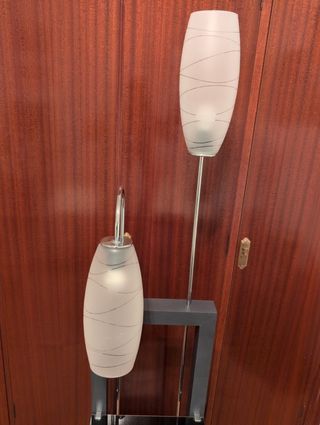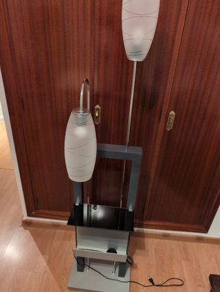 Preciosa lámpara de pie ideal para el salón. Tiene dos luces con pantallas de cristal opalino con detalles en relieve. La estructura es de madera gris oscuro y plata, con una balda de cristal negro y un revistero metálico. Está en muy buen estado. -1,70cm de altura. -39cm ancho de la base. -32cm ancho de la estructura. -Encendido por pulsador de pie. - Dos luces con pantallas de cristal. - Estructura metálica. - Balda de cristal negro. - Revistero metálico. Muy poco uso y en perfecto estado. No es negociable. No hago envíos por no desmontarla, solo recogida en persona.