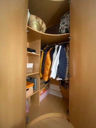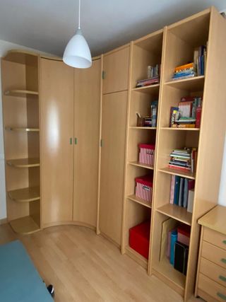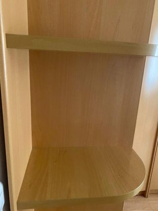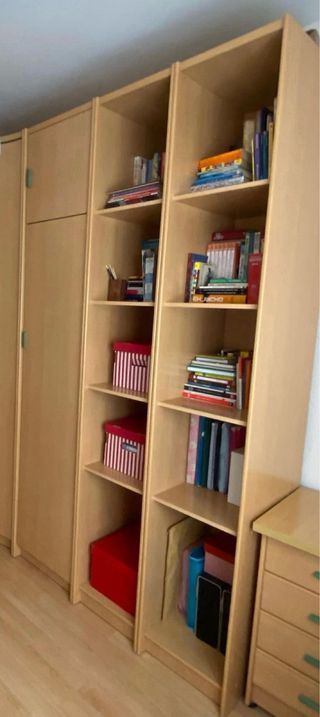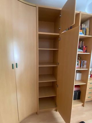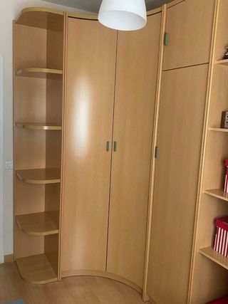 Venta por separado o junto —1 estantería de esquina con 5 baldas. Alto 240cm-Ancho 51cm-Fondo 31cm —1 armario de esquina: con puertas semicirculares. Interior con altillo, estantería y barra para colgar ropa. Alto 240cm-Fondo 51cm-Ancho 80cm —1 armario central con puertas y altillo. Interior con baldas/opción de barra para colgar. Alto 240cm-Fondo 51cm-Ancho 51cm —2 estanterías centrales: Alto 240- Fondo 51cm-Ancho 40cm —(Escritorio esquinero ha sido vendido) Material melamina de alta calidad color haya, tiradores verde claro.
