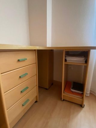 cama nido con almacenaje gran capacidad. armario esquinero muy accesible, con barra y altillo. mueble todo baldas interiores y cajones. mesilla con ruedas. escritorio con cajonera, balda y cubo decorativo. en perfecto estado. como nuevo. los herrajes estan impecables.
