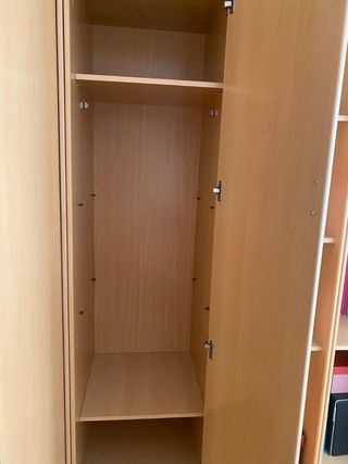 Complejo de melamina de alta calidad, en color beige. Ideal para organizar tu espacio. - Diseño elegante y funcional. - Incluye: > 1 armario central con puertas y altillo. Interior con baldas u opción de barra para colgar ropa. Alto 240cm- Fondo 51cm- Ancho 51 cm. 100€. > 2 estanterías centrales: Alto 240- Fondo 51 cm- Ancho 40cm. (100€ cada una) Escritorio, armario y estantería esquinera en mi perfil. Se puede comprar junto o por separado.
