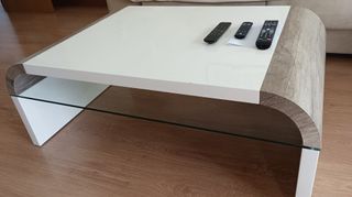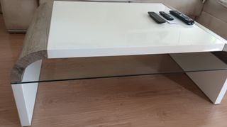Mesa de centro en buen estado. Elegante diseño curvado. Tiene una superficie blanca y detalles en color madera. Incluye una balda de cristal.
