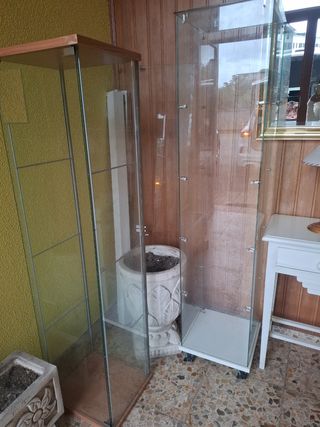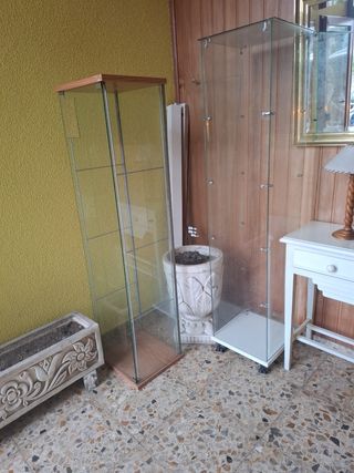 Se venden dos vitrinas expositoras. Una de ellas tiene ruedas para facilitar su movilidad. Ambas están fabricadas con cristal y madera, y lucen en buen estado. - Medidas aproximadas: Vitrina con ruedas: 1.70m alto x 0.50m ancho; Vitrina sin ruedas: 1.60m alto x 0.40m ancho. - Se venden juntas. O por separado la de ruedas es de Retif Ambas tienen sus baldas de cristal intactas en la de ruedas 4 en la normal 3