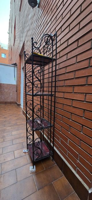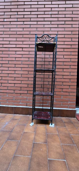 Elegante estantería de pie con un diseño forjado. - Cuatro niveles de baldas. - Estructura de metal resistente. - Acabado en color negro.