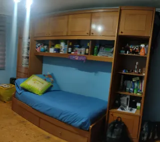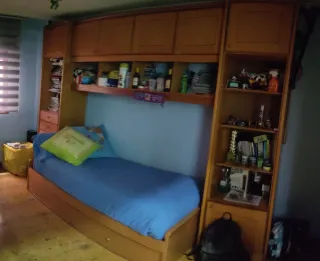 Se vende habitación juvenil completa, ideal para optimizar el espacio. - Cama con somieres y colchones tiene 2 camas de 90x190 - Estantería superior. - Armario lateral con baldas y cajones. - Estantería vertical con baldas.