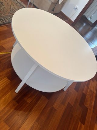 Mesa de centro redonda blanca con balda inferior para almacenamiento. Diseño moderno y práctico. En perfecto estado, sin ningún arañazo A recoger en Entrambasaguas