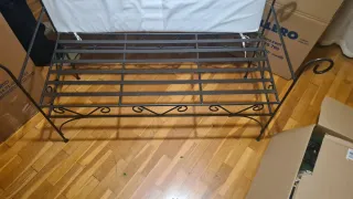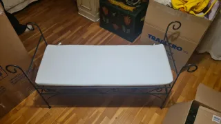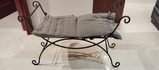 Banco de hierro forjado para pie de cama o recibidor. Muy sólido y estable, diseño decorativo con volutas. Medidas: 110 cm largo × 45 cm ancho × 47 cm alto. Le falta el cojín original, se puede poner uno fácilmente. Tiene algo de óxido superficial propio del uso, solo estético.