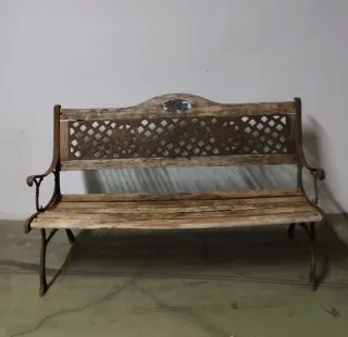 Banco rústico con estructura de hierro y asiento de madera. - Diseño clásico con respaldo decorado. - Patas de hierro forjado. - Asiento de lamas de madera.