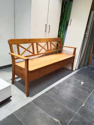 Banco de madera con baúl ,con un diseño clásico y robusto. Ideal para añadir un toque acogedor a cualquier espacio. Era una cadiera y lo hemos cortado por un lateral,el banco está perfecto pero en un lado se aprecia un poco raspadillo como ralladuras. - Fabricado en madera de alta calidad. - Acabado natural que resalta la veta de la madera.