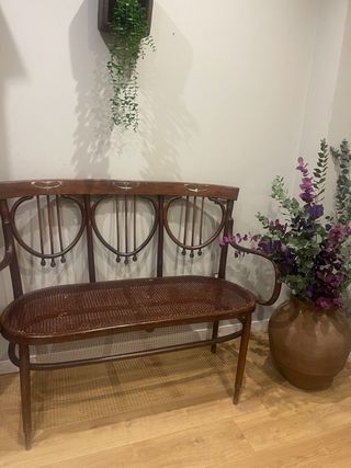 Precioso banco antiguo Thonet con un diseño clásico y elegante. - Estructura de madera maciza. - Asiento de rattan tejido a mano. - Respaldo curvo con detalles decorativos. - Patas torneadas.