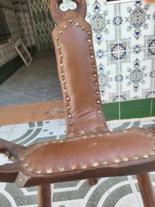 Banco antiguo con un diseño clásico, ideal para un dormitorio o recibidor. 10 euros cada uno. - Estructura de madera tallada con detalles. - Asiento tapizado en cuero. - Patas con diseño de cuentas. - Adornos metálicos en el asiento.