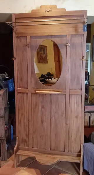 Precioso perchero antiguo con un diseño único y elegante. Ideal para dar un toque vintage a tu hogar. - Estructura principal de madera. - Barras y ganchos de metal dorado. - Espejo ovalado central. - Pequeña repisa. - Banco integrado en la parte inferior.