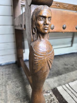 Instagram janoradeco. Espectacular bancouybantiguo. Estructura de madera tallada. Asiento de piel. Buena calidad. Muy decorativo. Pasar a ver. Medidas 170 x 54 y 112 de alto.
