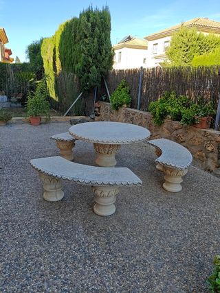 Conjunto de mesa y tres bancos de piedra con un diseño clásico y elegante. - Mesa redonda con base ornamentada. - Dos bancos curvos con soportes tallados.