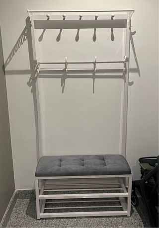 Perchero banco zapatero blanco cojín gris