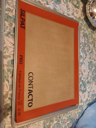 Se vende una bandeja para horno y una lámina de silicona para hornear Silpat PRO Contacto. La lámina es de color naranja y está prácticamente nueva. - Perfecta para hornear. - Fabricada en Francia. - Referencia R39.