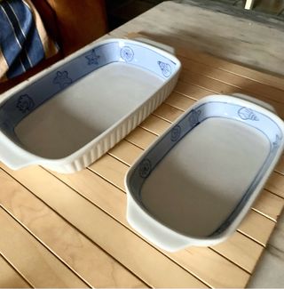 Set de dos bandejas de cerámica con un encantador diseño de conchas marinas en el borde interior. - Bandeja grande con ribetes acanalados. - Bandeja pequeña. - Diseño de conchas y estrellas de mar en azul. Se encuentran en buen estado.Medidas: 24cm/15cm y 19cm/12cm. Para servir o cocinar al horno/microondas. A recoger en Barcelona. No envíos . Las dos por 15€