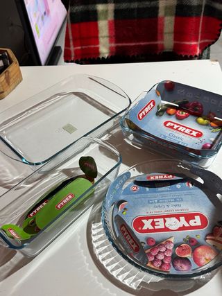 Set de bandejas de cristal para horno Pyrex. Son resistentes y versátiles para todo tipo de preparaciones. - Bandeja redonda de 1.1L (25x25 cm). - Bandeja rectangular de 2L (25x21 cm). - Bandeja rectangular alargada.