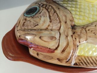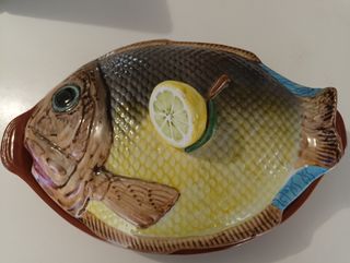 Bandeja de barro para horno y tapa de cerámica con forma de pez. Ideal para servir o como elemento decorativo.