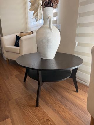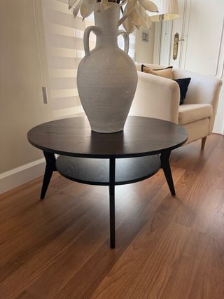 Elegante mesa auxiliar redonda con un diseño moderno y funcional. - Acabado en madera oscura. - Dos niveles para mayor espacio de almacenamiento. - Patas cónicas estilizadas.