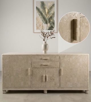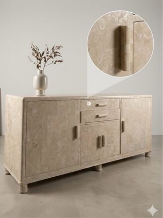 Elegante mueble de 194 cm con un diseño único. - Acabado en nacar con detalles dorados. - Materiales de alta calidad como mármol y piedra.