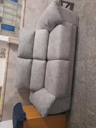 Sofá de tres plazas en muy buen estado, con muy poco uso. Su diseño moderno se adapta a cualquier estancia. - Tapicería de tela antimanchas - Color gris verdoso - Estructura robusta. - Asientos extraibles y respaldos reclinables